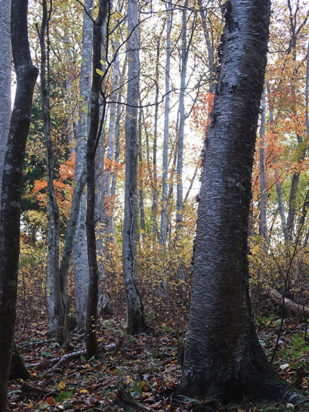 荒山さんは非皆伐を基本とする「天然生林施業」を主とした林業を行なっている。なるべく大きなインパクトを与えずに自然に近い形で施業することで、多様な生態系を維持することを目標にしているという。さまざまな樹種を一本ずつ観察して、互いの関係を見ながら選択的に伐採する「単木的管理」を行なう。