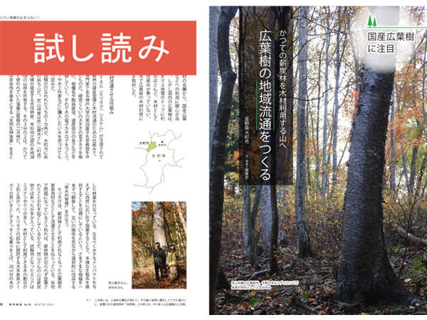 輸入広葉樹材の高騰から、国産広葉樹の家具材などへの利用に関心が高まっている。しかし国内の広葉樹は、製紙やバイオマス発電のチップに利用されるのがほとんど。木材として流通させる仕組みが整っていない。長野県大町市で広葉樹の木材利用に挑む人たちを取材した。
